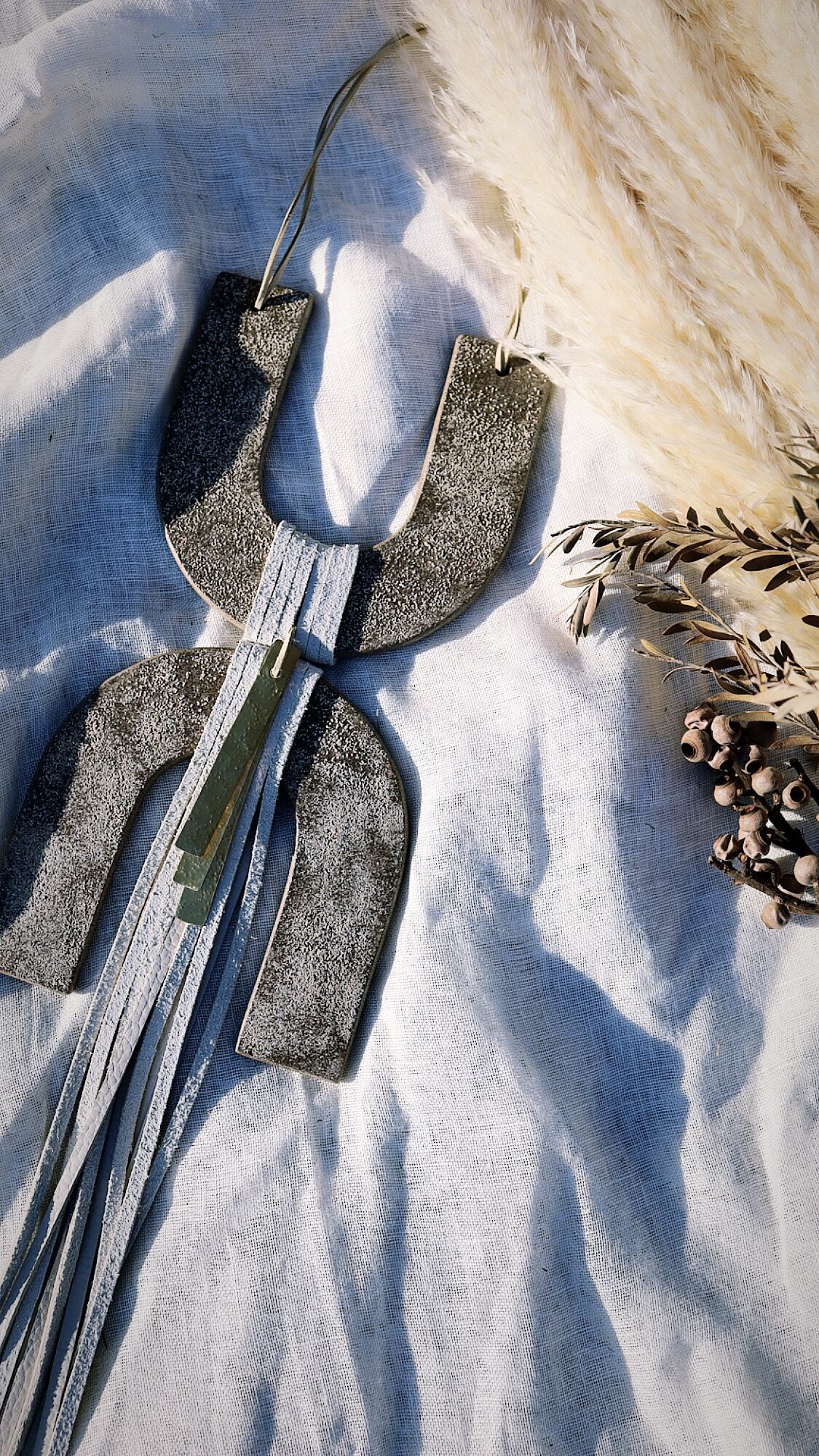 さまざまな形状のクラフト陶土と真鍮や牛本革の素材で組み合わせたウォール・ハンギング。