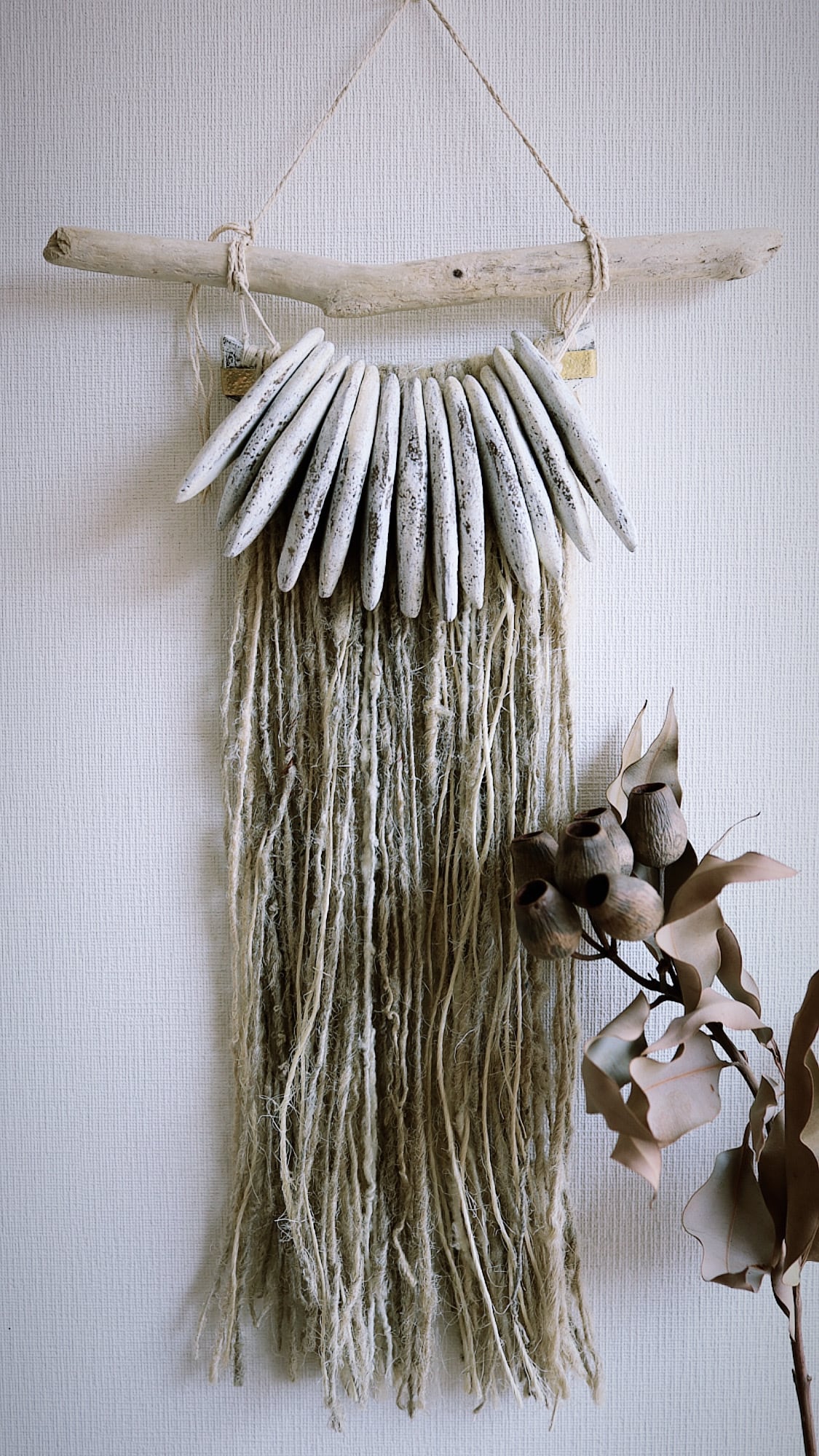 さまざまな形状のクラフト陶土と真鍮や流木、シルク糸の素材で組み合わせたウォール・ハンギング。