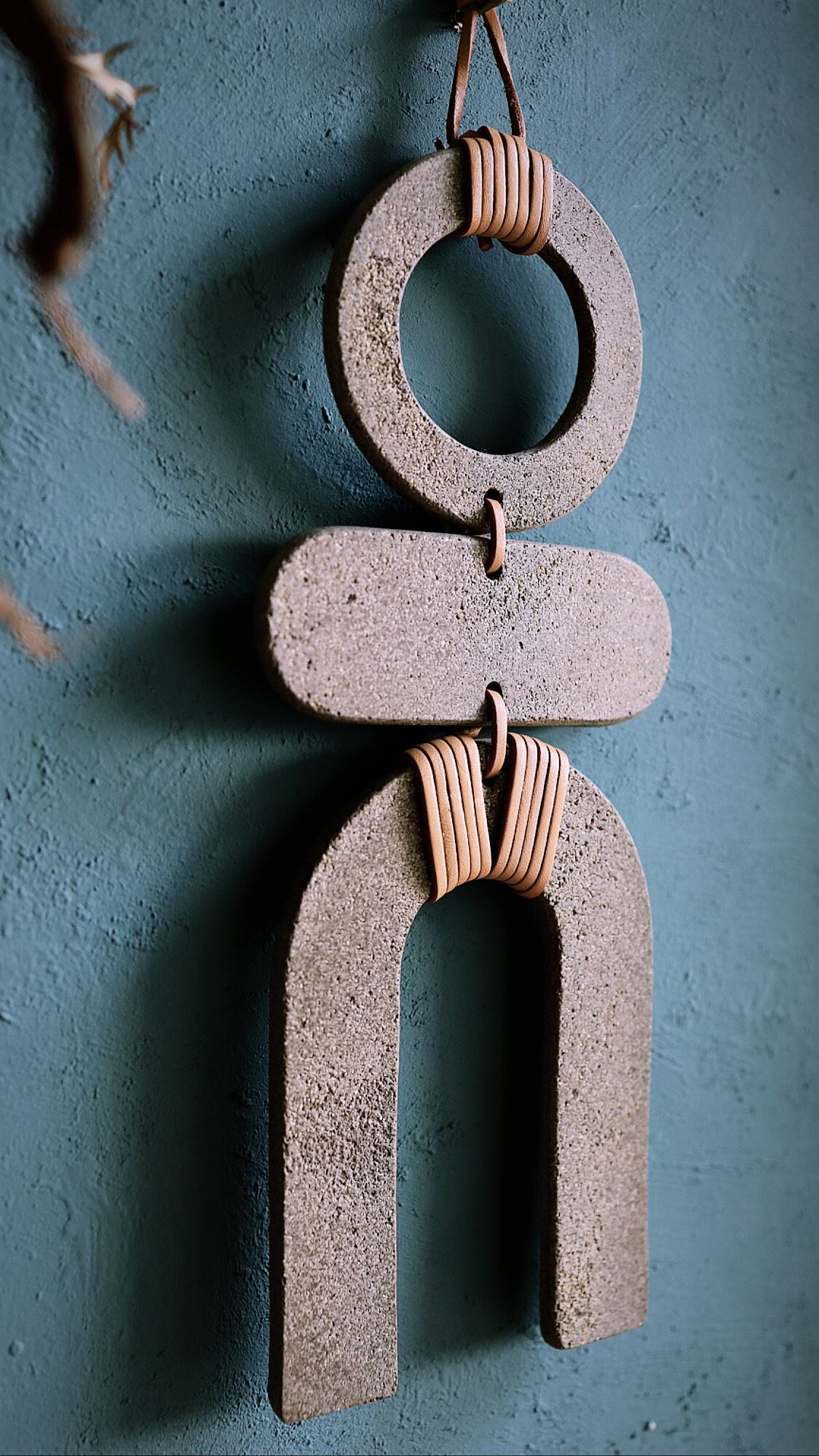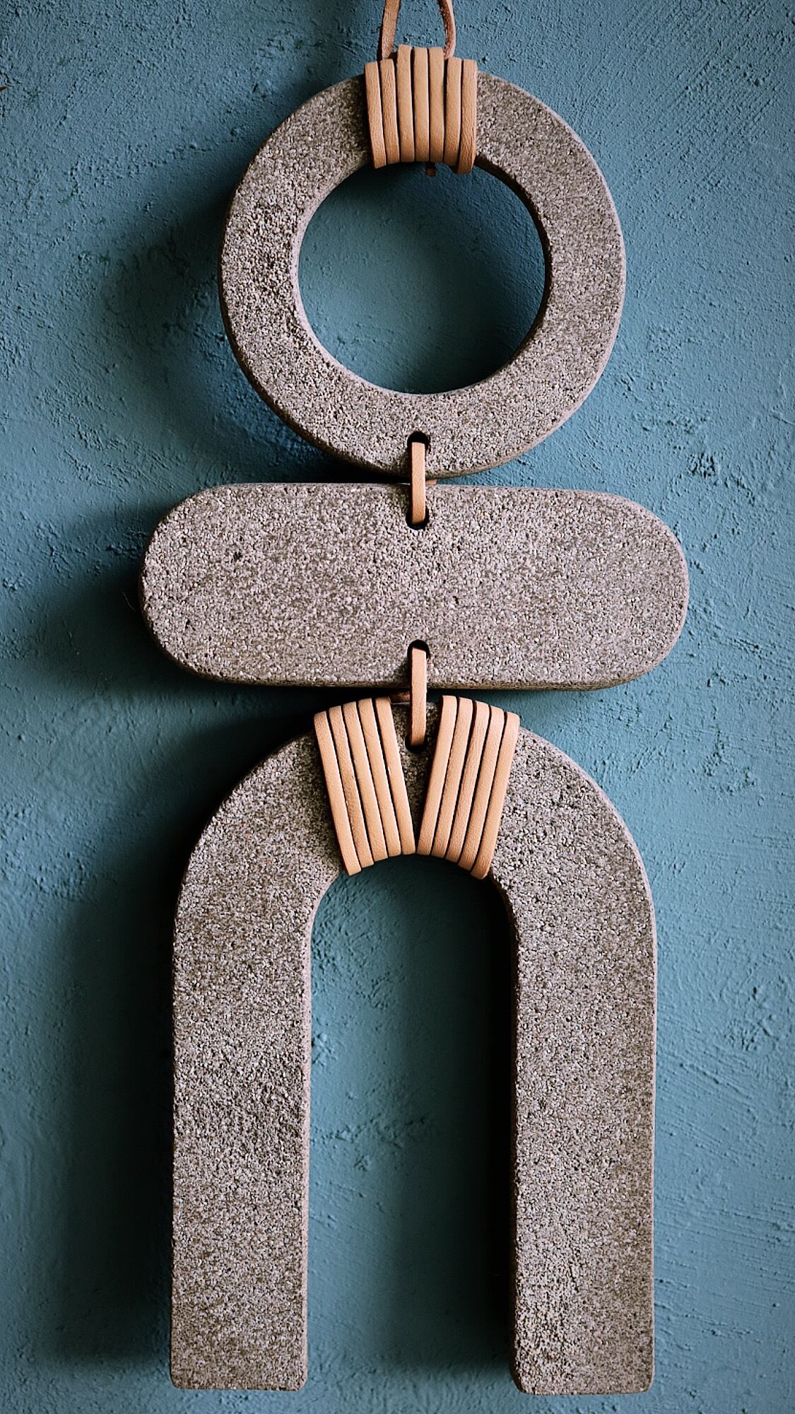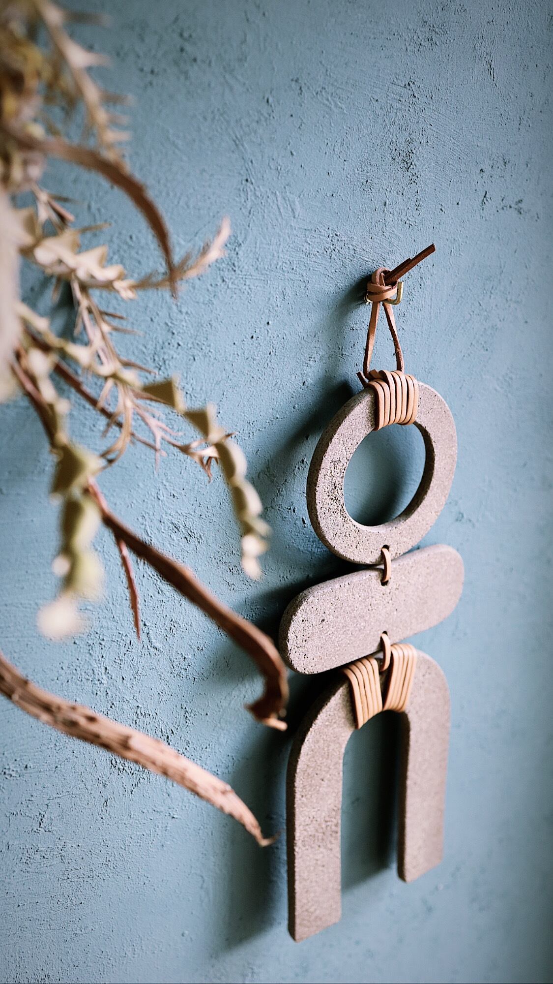 さまざまな形状のクラフト陶土や、ヌメ革の素材で組み合わせたウォール・ハンギング。