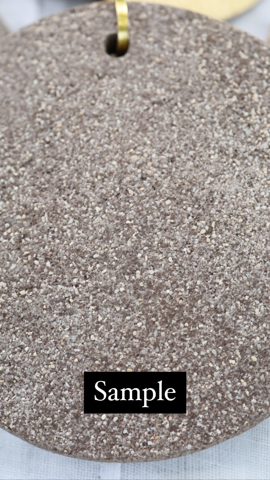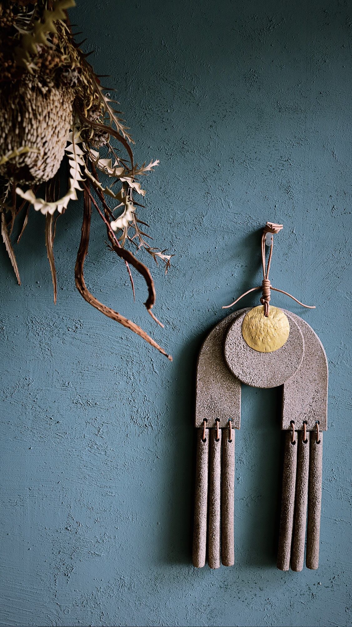 さまざまな形状のクラフト陶土と真鍮、ヌメ革の素材で組み合わせたウォール・ハンギング。